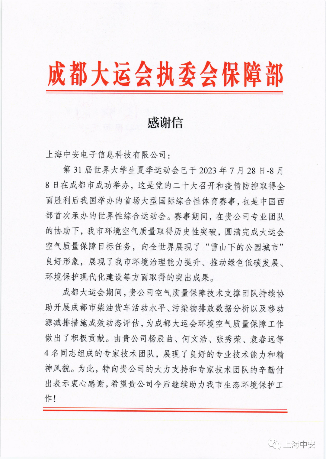 成都大運(yùn)會(huì)執(zhí)委會(huì)保障部發(fā)來一封感謝信?。?023-10-15)